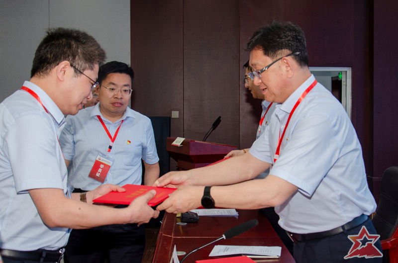 临沂沂蒙精神教育培训中心党支部书记、常务副主任邢庆杰为中国航空工业集团长风授班旗,班长刘义平接旗。