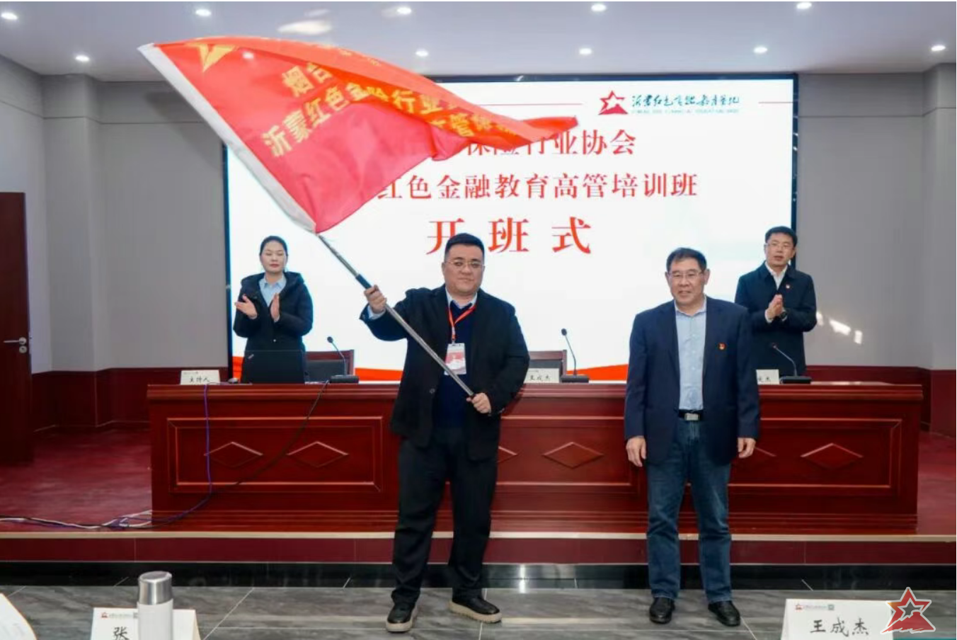 在开班式上,基地运营单位沂蒙培训中心党支部书记、常务副主任邢庆杰致欢迎辞。烟台市保险行业协会专职副会长王成杰向大家财险烟台中支总经理王飞授予班旗,并作培训动员讲话。