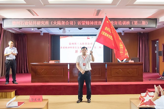 9月16日上午,培训班举行开班仪式,在开班仪式上,沂蒙干部教育培训中心领导致欢迎辞并授班旗,德州石油钻井研究所(大陆架公司)总经理助理、生产运行部主任孙文俊接旗。