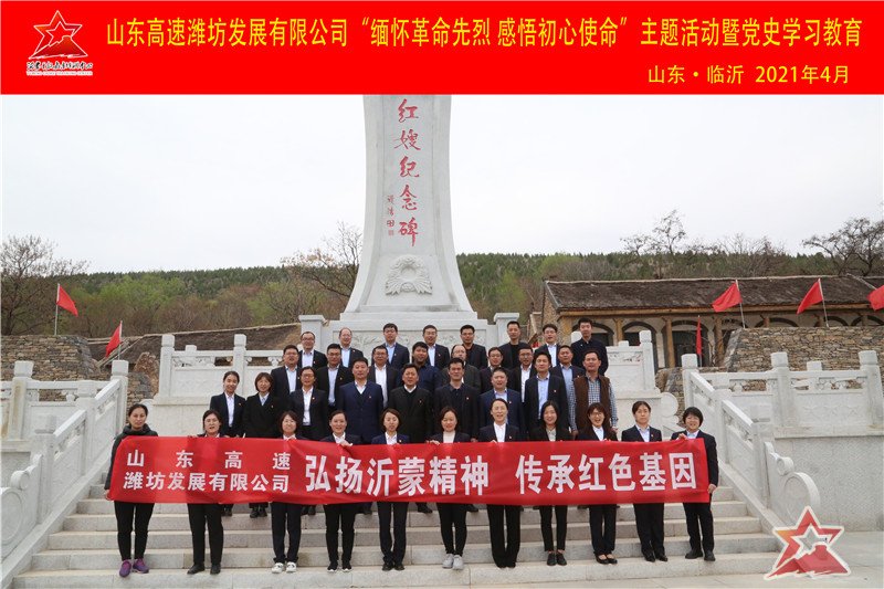 为认真贯彻落实习近平总书记在中央党史学习教育动员部署会议的重要讲话精神,扎实推动党史学习教育取得实效,积极传承红色精神、汲取奋进力量。4月1日,山东高速潍坊发展有限公司在临沂沂蒙干部教育培训中心的精心组织下,来到了沂蒙老区开展“缅怀革命先烈 感悟初心使命”主题活动暨党史学习教育。