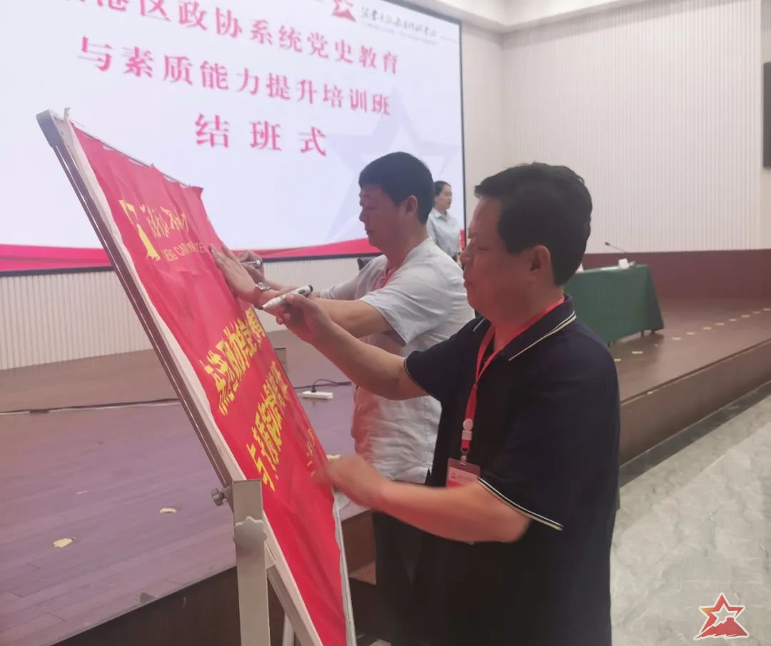 6月11日上午,培训班举行了结班式。结班式上,东港区区政协副主席安佰森作总结讲话。主席台领导颁发了结业证书,全体成员在班旗上签字留念。
