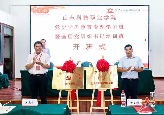 学习期间,山东科技职业学院党委副书记丁文利和沂蒙干部教育培训中心副主任尹昌运为“山东科技职业学院党校教学基地”,“山东职业学院传承红色基因教育基地”揭牌。