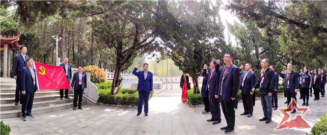 在烈士墓区,全体学员庄严肃立,向革命烈士敬献花篮,面对党旗重温入党誓词。