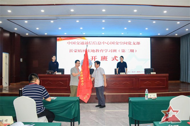 7月15日,中国交通通信信息中心国交空间公司副总经理李丽出席开班式,沂蒙精神教育培训中心教育长王燕翔致欢迎词,沂蒙精神教育培训中心顾问、沂蒙党史专家郑国华为本班授班旗,公司副总经理李丽作动员讲话。