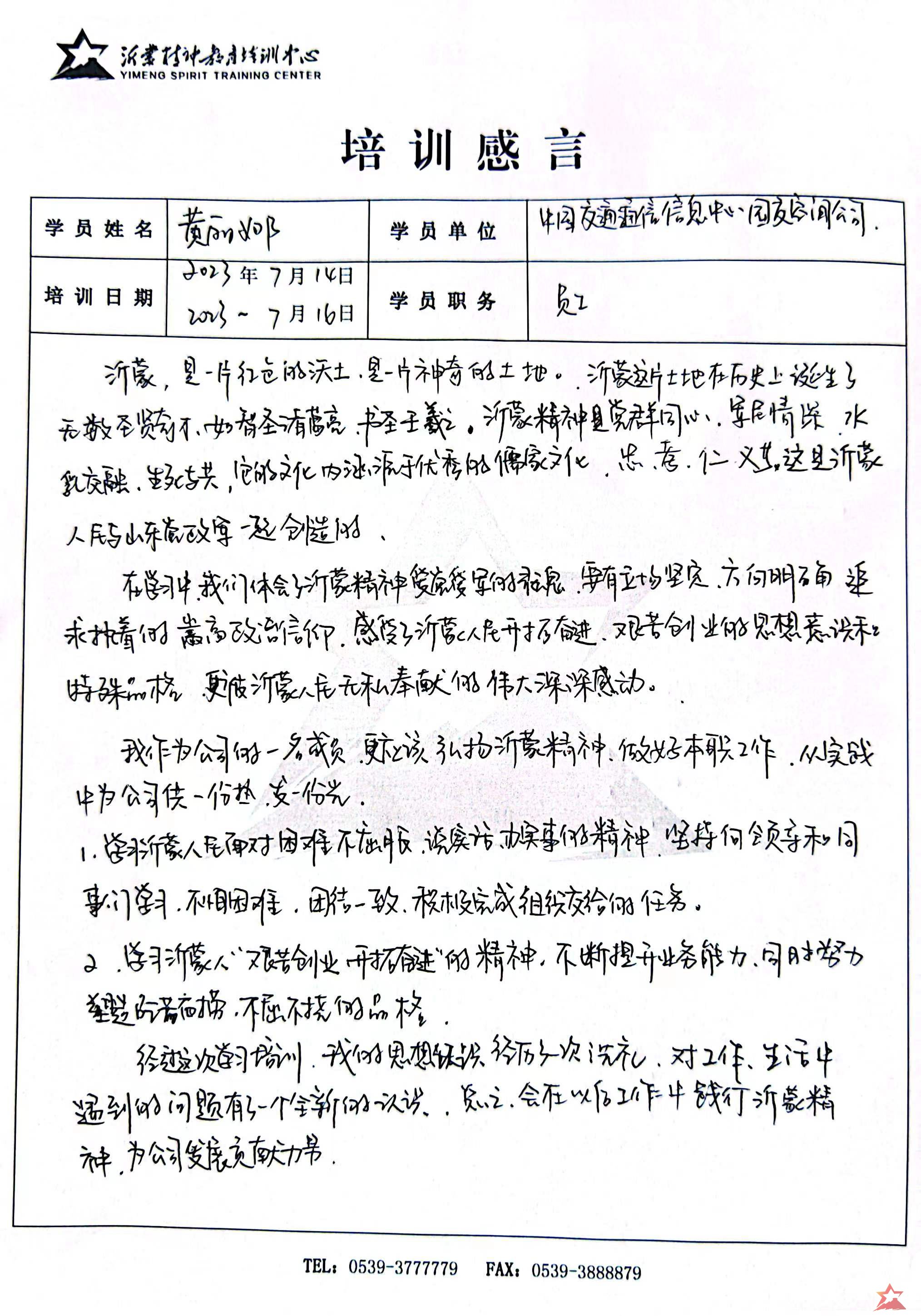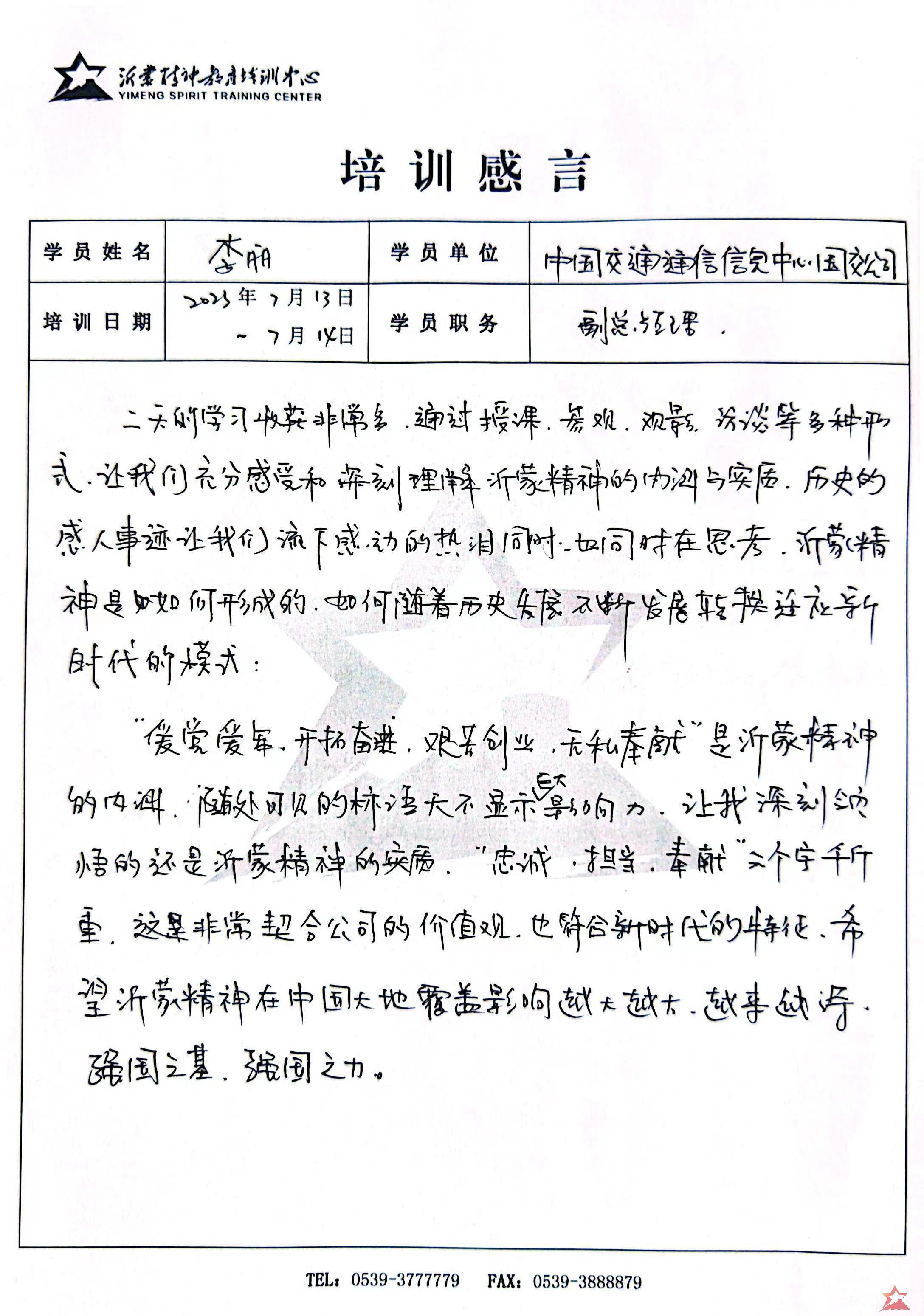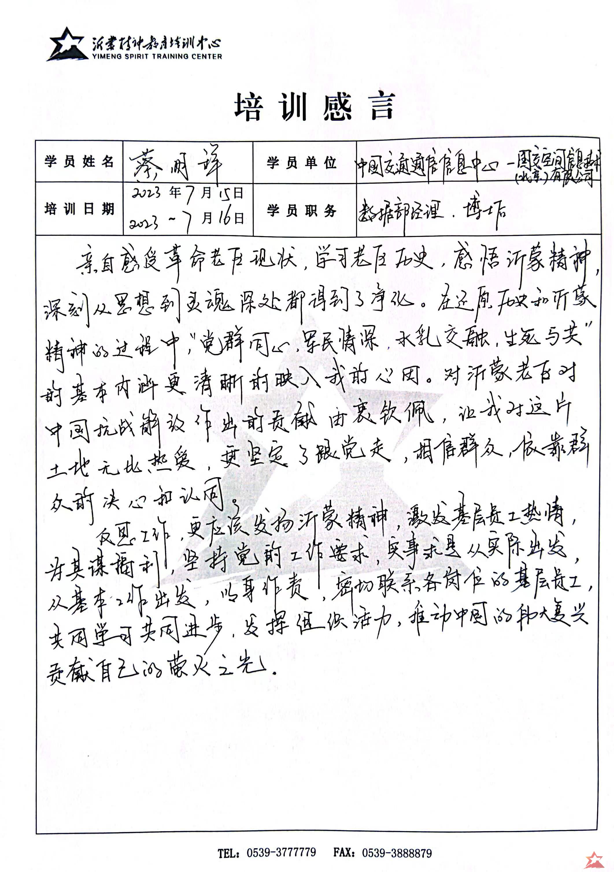 2023年7月14日至7月16日,中国交通通信信息中心国交空间党支部沂蒙精神实地教育学习班(第二期)在沂蒙精神教育培训中心成功举办。本次培训的主要目的是贯彻落实交通运输部党组和中国交通通信信息中心党委深入学习贯彻党的二十大精神,传承红色基因、锤炼党性修养,进一步提高认识、开拓视野,创新思路、激发干劲,努力当好中国现代化的开路先锋。