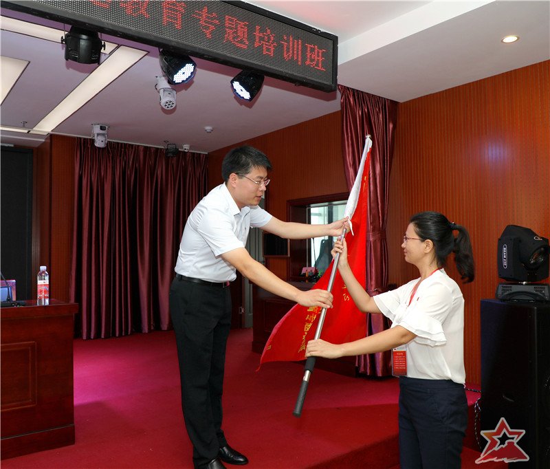 开班仪式上,共青团江门市委副调研员周穗花同志作动员讲话,周处指出,此次学习机会来之不易,通过深入开展“不忘初心 牢记使命”主题教育,重温山东革命老区斗争史,感悟先辈的革命精神,接受沂蒙精神熏陶,进一步加强党性修养,坚定理想信念,使沂蒙精神成为大家以后工作的精神动力。沂蒙干部教育培训中心副主任邢庆杰对沂蒙干部教育培训中心作了介绍,并代表中心对江门共青团的到来表示热烈欢迎,随后,他将班旗隆重授予培训学员代表手中。
