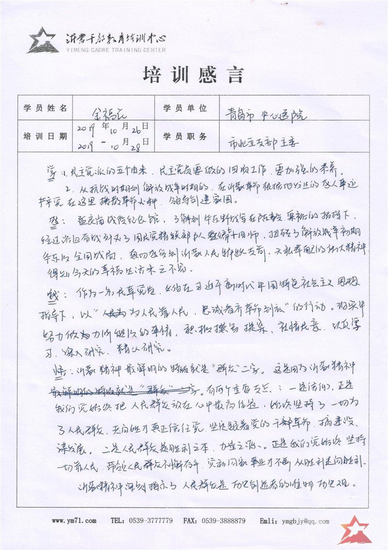 三、行。培训结束回到支部,及时传达好培训精神,弘扬沂蒙精神。把“不忘合作初心,继续携手前进”主题教育活动作为重大政治任务,铭记合作初心、激发奋进力量,教育引导党员以饱满的精神状态积极投身主题教育活动。