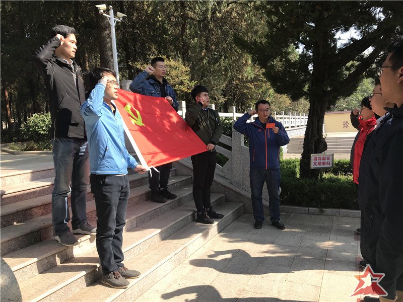 结束纪念馆参观后,学员们来到大青山胜利突围纪念馆,向革命烈士敬献花圈。在烈士纪念碑前,学员们面对鲜红的党旗,重温入党誓词,在革命先辈前再次庄严许下对党的承诺。